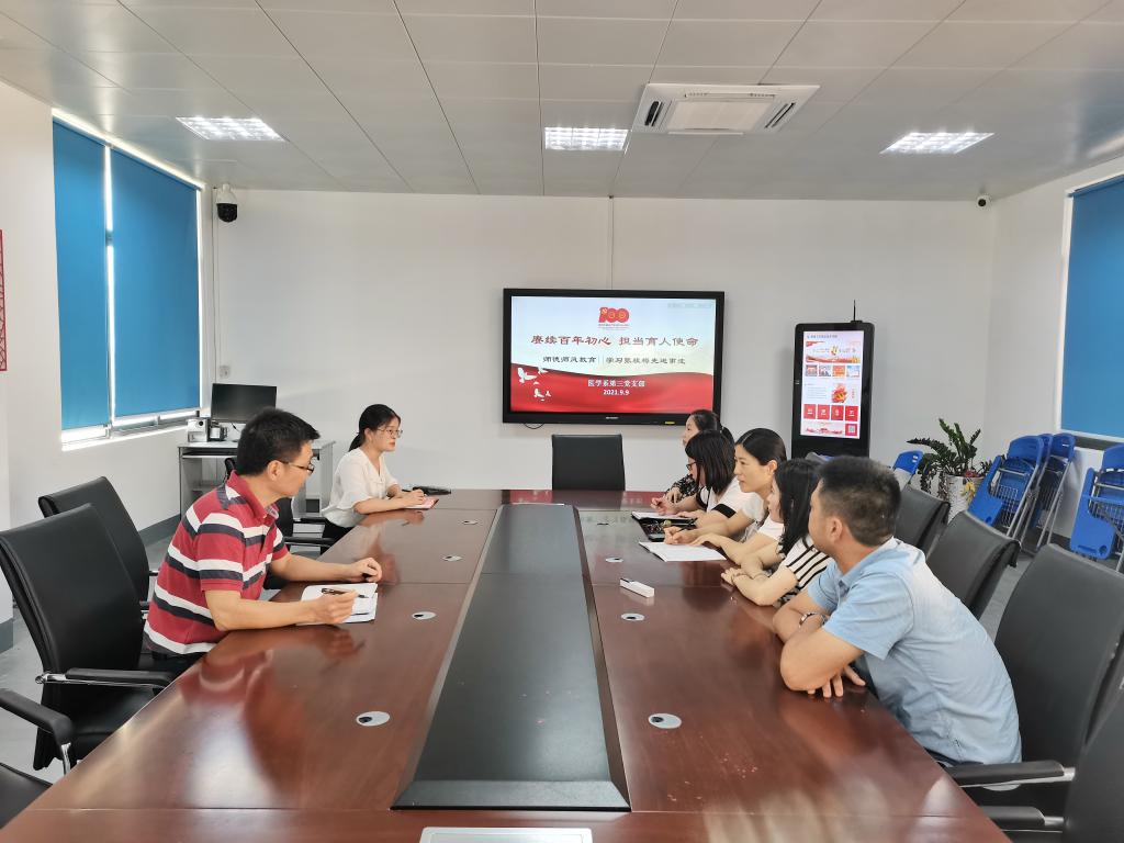 為加強(qiáng)支部師德師風(fēng)建設(shè),激勵(lì)支部黨員教師堅(jiān)守教育初心,牢記立德樹人使命,2021年9月9日中午,醫(yī)學(xué)系第三黨支部在實(shí)訓(xùn)樓311開展“賡續(xù)百年初心,擔(dān)當(dāng)育人使命”主題師德師風(fēng)教育,組織支部黨員們一同觀看全國“時(shí)代楷?!薄獜埞鹈吠鞠冗M(jìn)事跡紀(jì)錄片。
