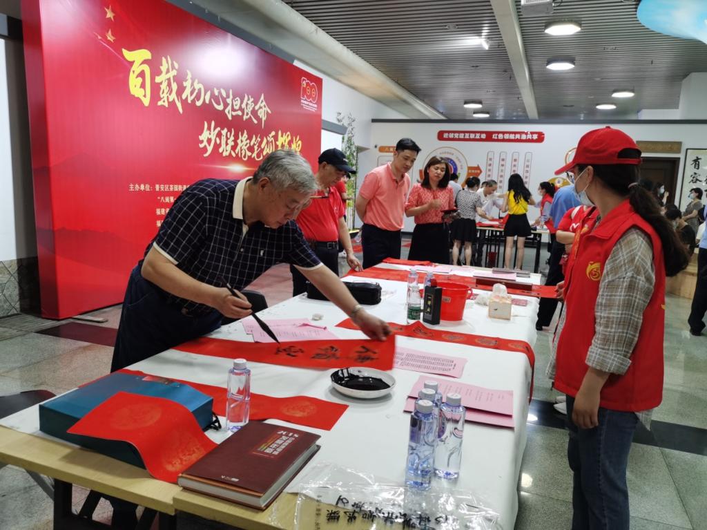 主題活動(dòng)現(xiàn)場(chǎng),來自省市楹聯(lián)學(xué)會(huì)的書法家們揮毫潑墨,以慶祝中國共產(chǎn)黨成立100周年為創(chuàng)作主題,以書春送祝福的形式,免費(fèi)贈(zèng)送給各黨建聯(lián)盟單位和現(xiàn)場(chǎng)過往的旅客,以聯(lián)言志、以墨寄情,與廣大市民一起回顧我們黨偉大而光輝的歷程,以實(shí)際行動(dòng)為中國共產(chǎn)黨建黨一百周年獻(xiàn)禮。