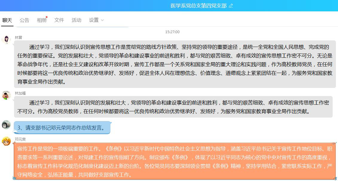 最后,醫(yī)學(xué)系第四黨支部書(shū)記鄧元榮同志做了總結(jié)發(fā)言,表示宣傳工作是黨的一項(xiàng)極端重要的工作,《條例》體現(xiàn)了以習(xí)近平同志為核心的黨中央對(duì)宣傳工作的高度重視。他要求全體黨員同志要深刻領(lǐng)會(huì)貫徹《條例》精神,堅(jiān)持學(xué)用結(jié)合,緊密聯(lián)系實(shí)際工作,嚴(yán)守網(wǎng)絡(luò)安全,弘揚(yáng)正能量,共同做好支部宣傳工作。