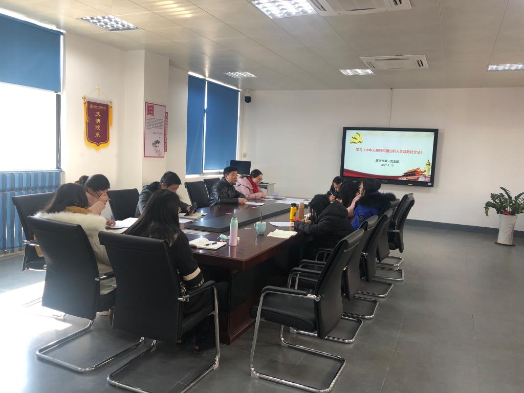 2021年1月13日,醫(yī)學系第一支部開展學習《中華人民共和國公職人員政務(wù)處分法》主題黨日活動。活動在實訓樓311會議室進行,由支部書記朱翔主持。