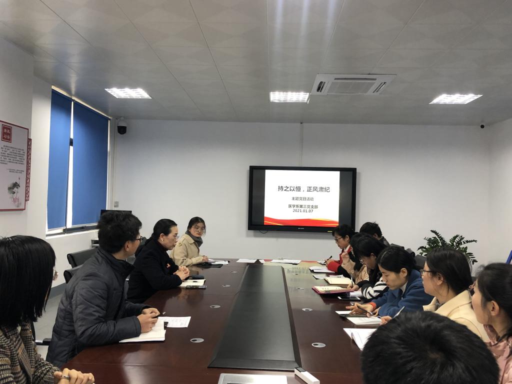 為進(jìn)一步增強(qiáng)支部黨員的紀(jì)律意識(shí),提升黨性修養(yǎng),2021年1月7日中午,醫(yī)學(xué)系第三黨支部在實(shí)訓(xùn)樓311會(huì)議室開展“持之以恒,正風(fēng)肅紀(jì)”主題黨日活動(dòng)。活動(dòng)由支部書記陳銘同志主持。