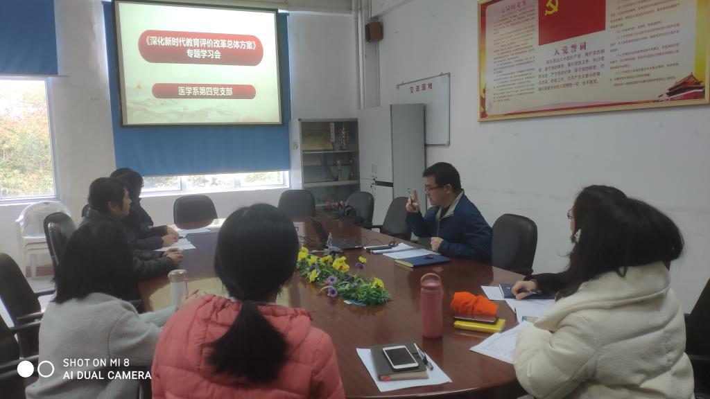 為深入學習貫徹中共中央、國務院印發(fā)的《深化新時代教育評價改革總體方案》的文件精神,12月31日下午,醫(yī)學系第四黨支部書記鄧元榮同志組織支部全體黨員進行專題學習討論。
