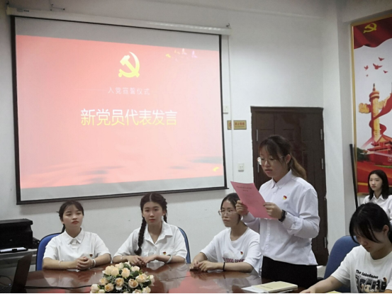 宣誓結(jié)束后,新黨員代表林詩穎同學結(jié)合自身實際情況作了發(fā)言。她表示作為黨組織的新人,要深入學習貫徹落實習近平總書記在慶祝中國共產(chǎn)黨成立100周年大會上的重要講話精神,以實際行動踐行入黨誓詞,以實現(xiàn)中華民族偉大復興為己任,不負時