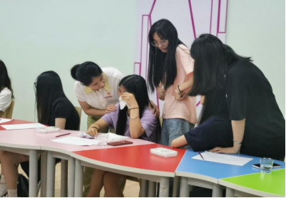 在“雨中人”主題繪畫環(huán)節(jié),同學(xué)們在白紙上根據(jù)要求自由發(fā)揮,并涂上顏色。隨后雪梅老師一一為大家解讀了畫的寓意,如雨滴的大小代表壓力的大小,傘、屋檐等保護物其實就是自己感知到的面對壓力的支持力量,她還就畫的布局分析了同學(xué)們的性格和處事方式。