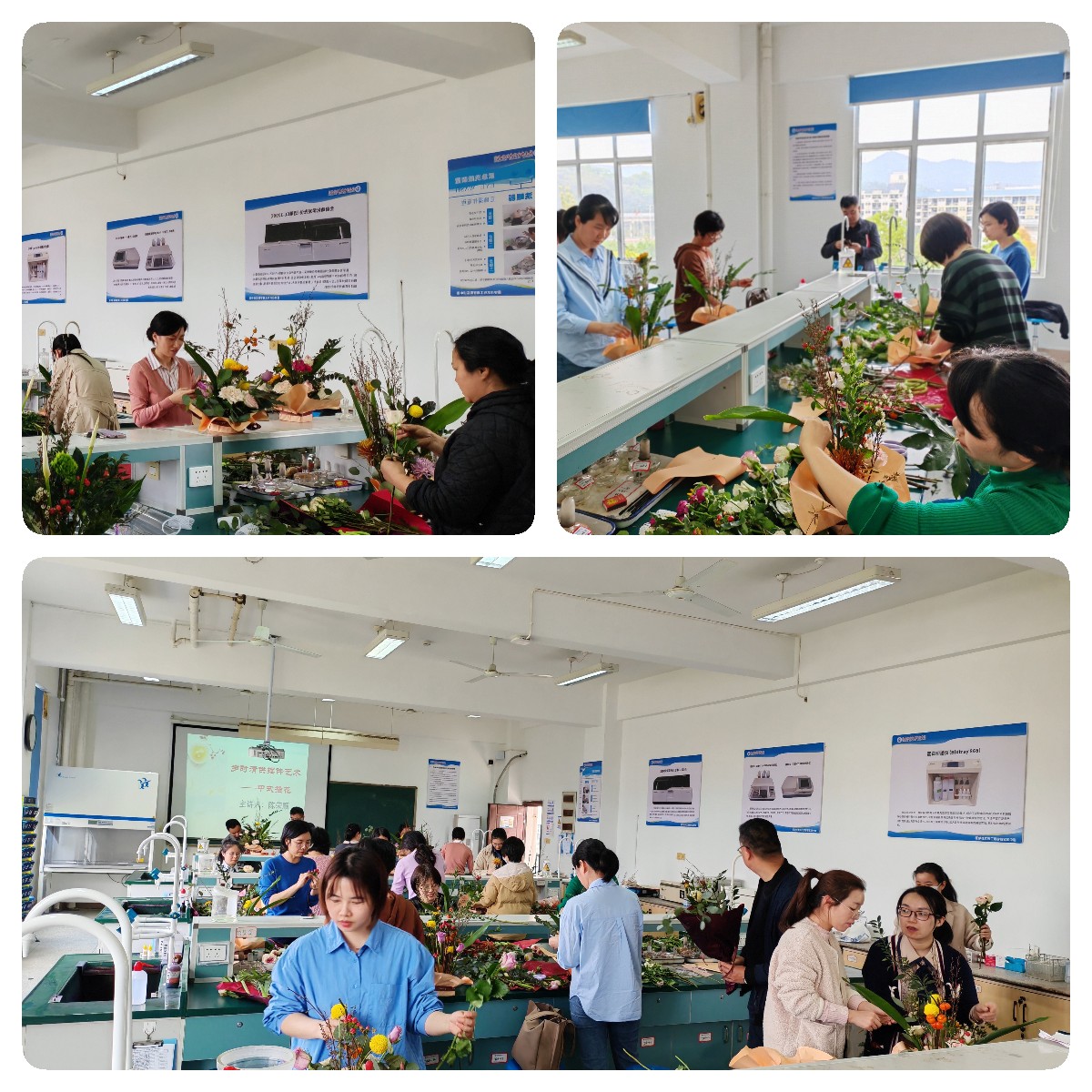 參與活動的教職工們邊學(xué)習(xí)邊創(chuàng)作,把玫瑰花、向日葵、球菊、桔梗、萬年青、燈籠果等花木枝葉精心修剪,巧妙搭配,創(chuàng)意組合。一束束別出心裁的插花作品在專業(yè)授課老師的指導(dǎo)下逐漸完工。