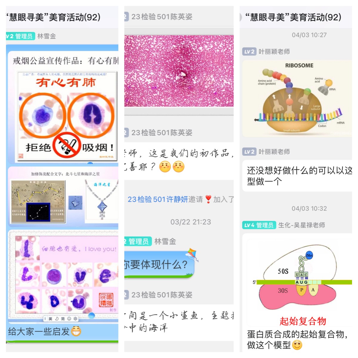 在醫(yī)工學(xué)院師生支部的共同推動(dòng)下,本次活動(dòng)共收到52份團(tuán)隊(duì)或個(gè)人作品。作品包括繪畫創(chuàng)意類、手工創(chuàng)意類、圖像創(chuàng)意類,每一件作品都是專業(yè)與藝術(shù)的融合體,生動(dòng)地傳遞著美的認(rèn)知,更透射出創(chuàng)作者對(duì)醫(yī)學(xué)檢驗(yàn)技術(shù)專業(yè)知識(shí)的認(rèn)識(shí)。同學(xué)們紛紛表示通過參與本次活動(dòng),他們對(duì)專業(yè)知識(shí)有了更深入、更全面的理解。