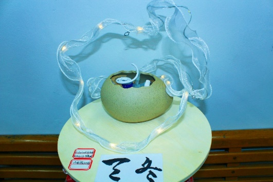 23檢驗(yàn)302班羅慧玲說:“我們的作品想傳遞中國(guó)書法的自然飄逸之美,同時(shí)展示酶的活性中心的特點(diǎn)以及必需基團(tuán)的功能。在創(chuàng)作過程中老師給我們?cè)敿?xì)講解了相關(guān)知識(shí)點(diǎn),提出在作品中要體現(xiàn)酶的活性中心是蛋白質(zhì)局部空間結(jié)構(gòu)區(qū)域的特點(diǎn)。經(jīng)過討論我們決定用陶瓷罐作為活性中心的表現(xiàn)載體,并用鐵線將其與綢帶連接形成一個(gè)整體。為了反映活性中心外必需基團(tuán)的功能,我們特別在靠近陶瓷罐的綢帶部位設(shè)計(jì)了一個(gè)盤扣狀的裝飾,用來表達(dá)活性中心外的必需基團(tuán)是為了穩(wěn)定活性中心的結(jié)構(gòu)。通過這個(gè)作品的創(chuàng)作,我們徹底搞清楚酶的活性中心,也懂得幾種類型必需基團(tuán)的分布和作用。真的是很有趣也很深刻的認(rèn)知過程。”