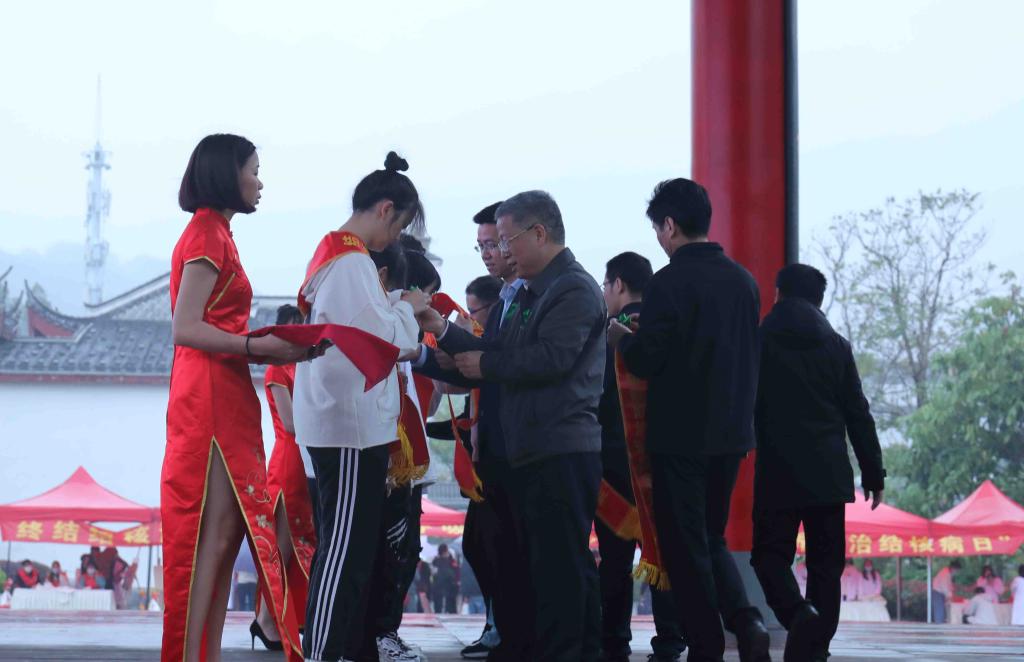 領(lǐng)導(dǎo)來(lái)賓為志愿者代表頒發(fā)綬帶、佩戴綠絲帶