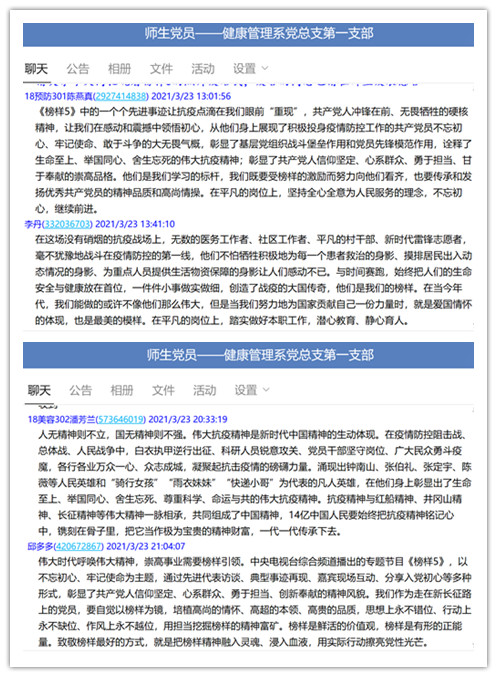 觀看后,健康管理系黨總支第一支部組織委員李丹同志表示,在這場沒有硝煙的抗疫戰(zhàn)場上,無數(shù)的醫(yī)務工作者、社區(qū)工作者、平凡的村干部、新時代雷鋒志愿者,毫不猶豫地戰(zhàn)斗在疫情防控的第一線,他們不怕犧牲積極地為每一個患者救治的身影、摸排居民出入動態(tài)情況的身影、為重點人員提供生活物資保障的身影讓人們感動不已。與時間賽跑,始終把人們的生命安全與健康放在首位,一件件小事做實做細,創(chuàng)造了戰(zhàn)疫的大國傳奇,他們是我們的榜樣。在當今年代,我們能做的或許不像他們那么偉大,但是當我們努力地為國家貢獻自己一份力量時,就是愛國情懷的體現(xiàn),也是最美的模樣。在平凡的崗位上,踏實做好本職工作,潛心教育、靜心育人。