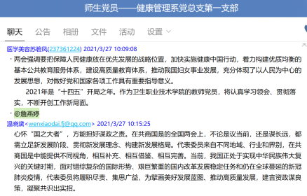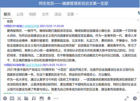 2021年3月25日,健康管理系黨總支第一支部組織全體黨員進(jìn)一步學(xué)習(xí)黨的十九屆五中全會(huì)精神和兩會(huì)精神,以深刻認(rèn)識(shí)、準(zhǔn)確把握全國兩會(huì)精神、黨的十九屆五中全會(huì)精神和習(xí)近平總書記重要講話的豐富內(nèi)涵和精神實(shí)質(zhì)。