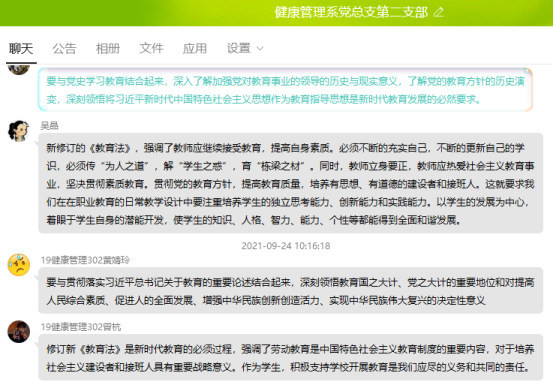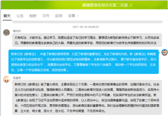 9月24日,健康管理系黨總支第二支部組織全體師生黨員開(kāi)展專題學(xué)習(xí)交流會(huì),學(xué)習(xí)新修訂的《中華人民共和國(guó)教育法》。會(huì)議由支部書(shū)記張凱捷主持。