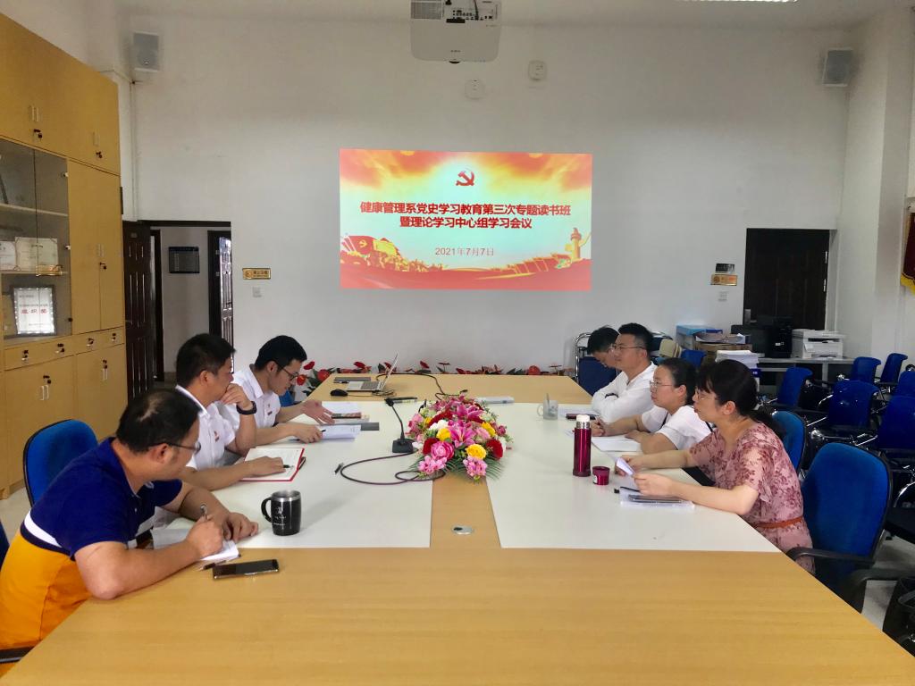 2021年7月7日,健康管理系黨史學習教育讀書班第三次學習暨中心組學習會在會議室505召開專題學習,本次學習會議由健康管理系黨總支書記黃曦主持。