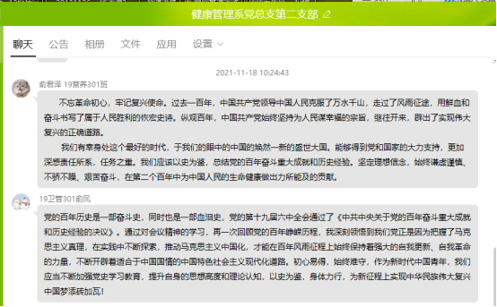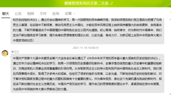2021年11月18日,健康管理系黨總支第二支部全體黨員開展學(xué)習(xí)《中共中央關(guān)于黨的百年奮斗重大成就和歷史經(jīng)驗(yàn)的決議》、《中共中央關(guān)于黨的百年奮斗重大成就和歷史經(jīng)驗(yàn)的決議》、《中國共產(chǎn)黨第十九屆中央委員會第六次全體會議公報(bào)》的學(xué)習(xí)。