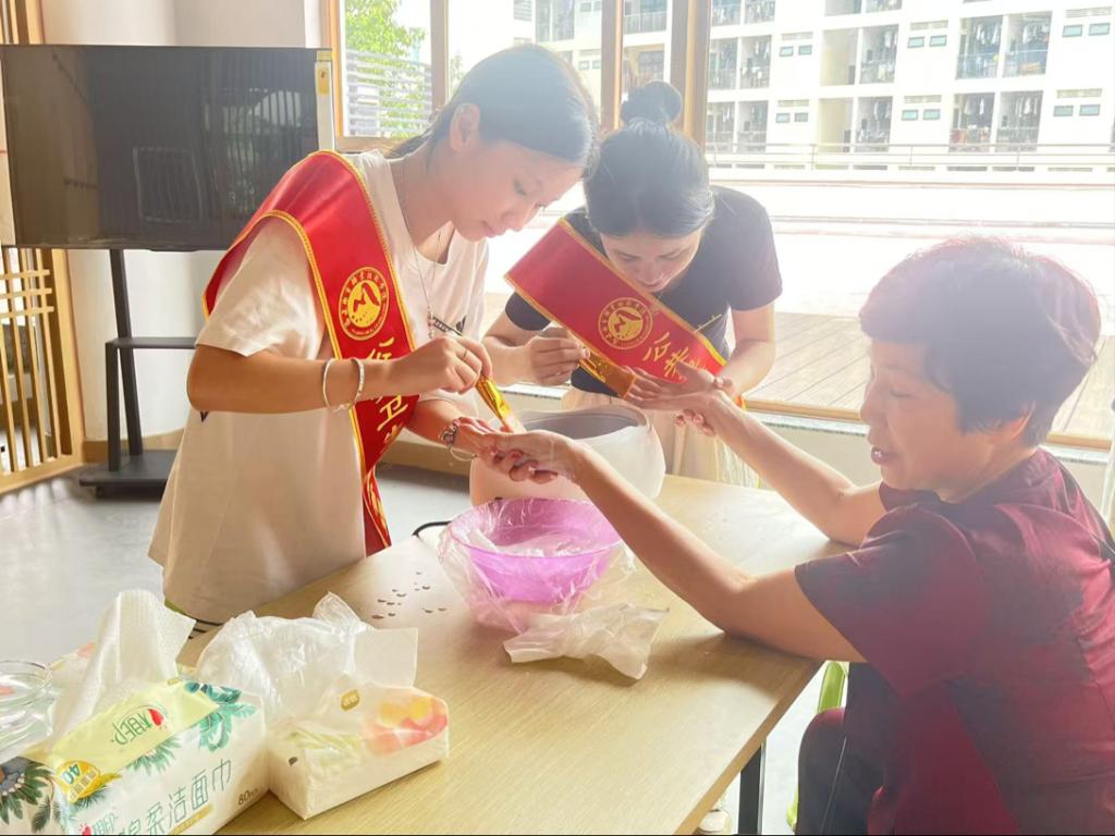 在美兮工作室,退休教師來(lái)嘗試蜜蠟手部護(hù)理、AI換妝、超聲波等,給老師們帶來(lái)不一樣的感受。 AI換裝讓退休教師們體驗(yàn)各種不同的妝容,讓大家找到適合自己的妝容,蜜蠟手部護(hù)理溫和的祛除角質(zhì)滋養(yǎng)手部為教師們的手部煥膚。活動(dòng)中大家熱情高漲,既通過自己的勞動(dòng)表達(dá)了對(duì)退休老師的關(guān)懷。