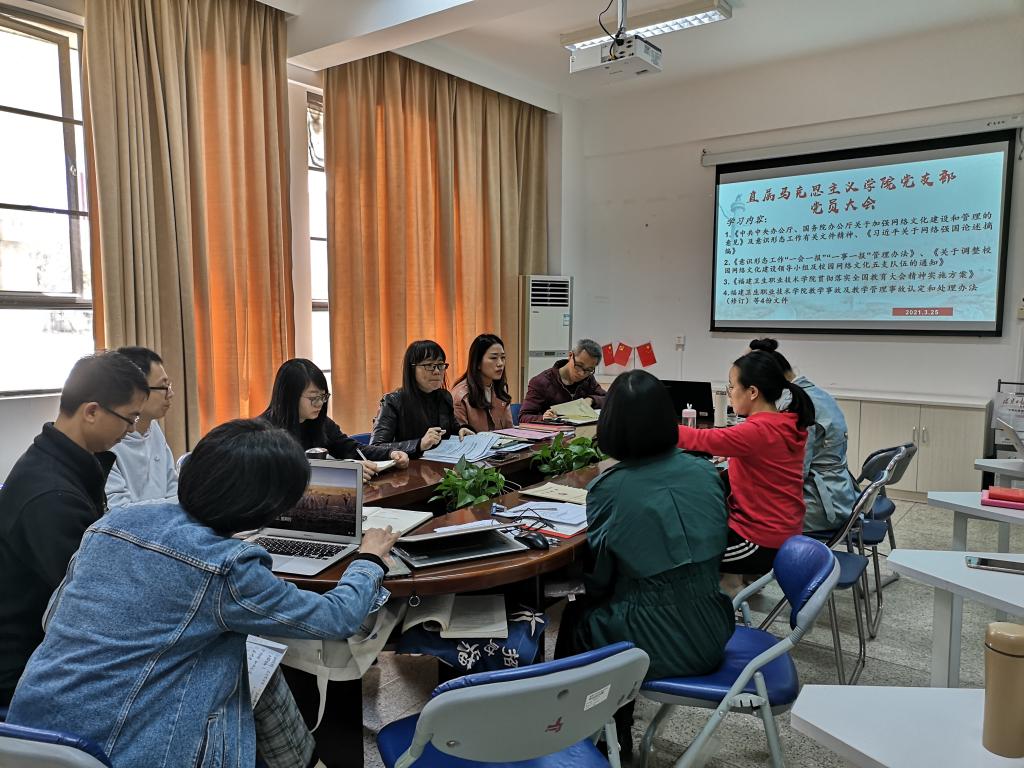 隨后,支部黨員學習了《意識形態(tài)工作“一會一報”“一事一報”管理辦法》、《關于調整校園網絡文化建設領導小組及校園網絡文化五支隊伍的通知》、《福建衛(wèi)生職業(yè)技術學院貫徹落實全國教育大會精神實施方案》、福建衛(wèi)生職業(yè)技術學院教學事故及教學管理事故認定和處理辦法(修訂)等4份文件,支部黨員教師進一步明確了在學校意識形態(tài)工作、校園網絡文化建設工作、日常教學工作中的崗位職責。