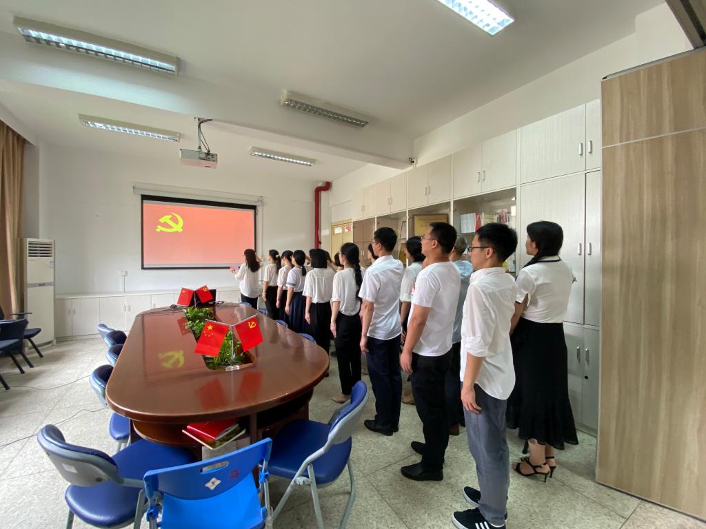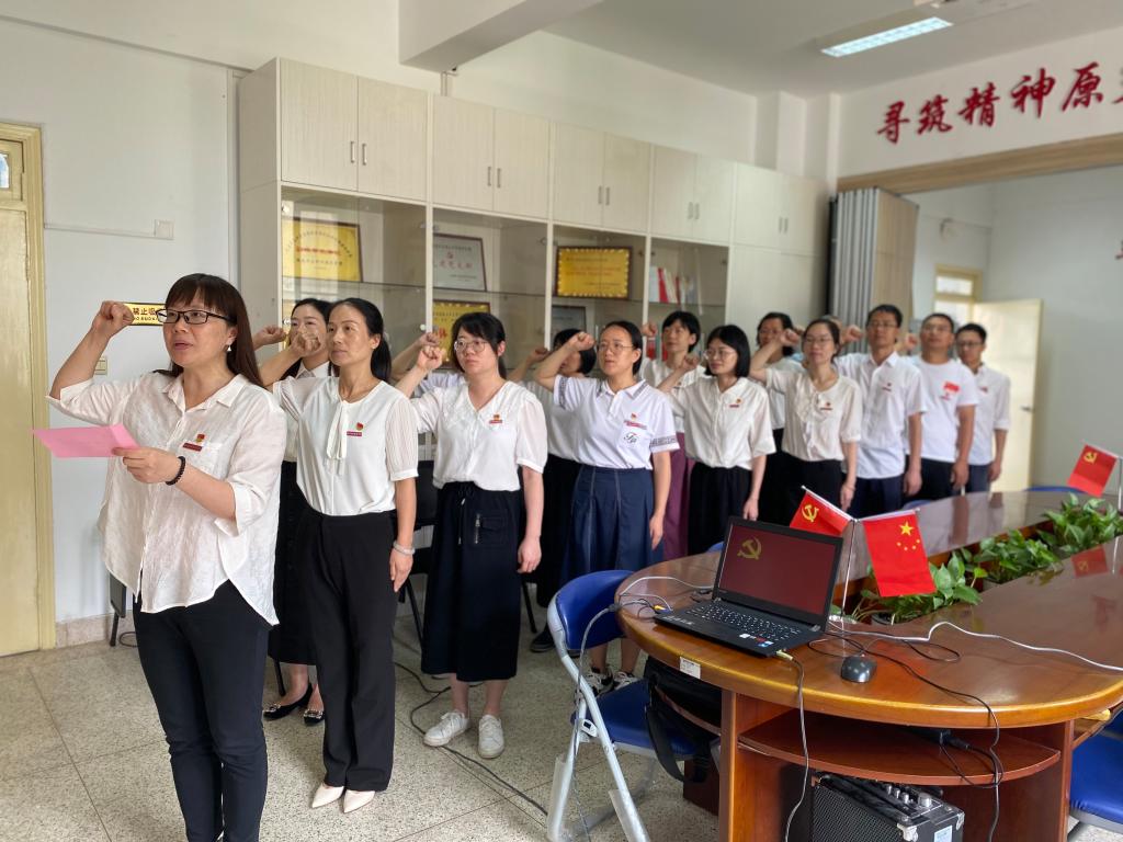 直播結(jié)束后,在莊嚴(yán)的《國際歌》聲中,全體教師黨員矗立在黨旗前,在熊美蘭同志的帶領(lǐng)下重溫入黨誓詞。