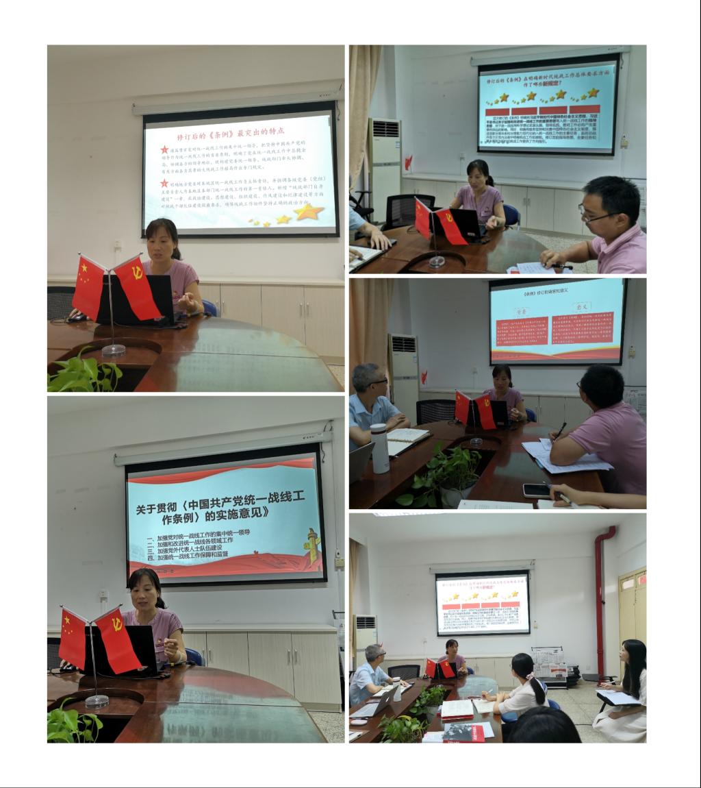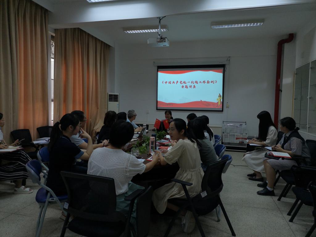 會上,黨支部開展了《中國共產(chǎn)黨統(tǒng)一戰(zhàn)線工作條例》專題講座,由直屬馬克思主義學(xué)院黨支部副書記來朋珍主講。她從《條例》的背景、意義、新時(shí)代具體要求和最突出的特點(diǎn)等方面進(jìn)行解讀。全體黨員同志還進(jìn)一步學(xué)習(xí)了《關(guān)于貫徹〈中國共產(chǎn)黨統(tǒng)一戰(zhàn)線工作條例〉的實(shí)施意見》。