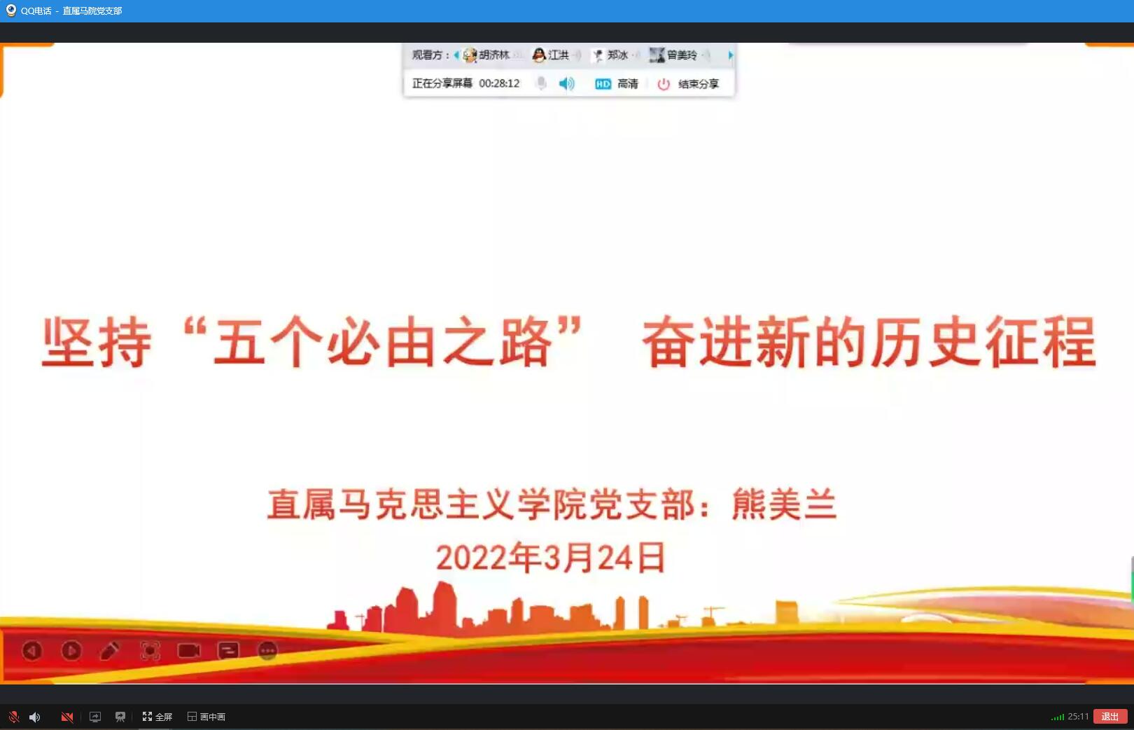 為了更好地學(xué)習(xí)宣傳貫徹兩會(huì)精神,2022年3月24日上午,直屬馬克思主義學(xué)院黨支部熊美蘭書(shū)記通過(guò)QQ群平臺(tái)線上為黨支部作了題為“堅(jiān)持‘五個(gè)必由之路’ 奮進(jìn)新的歷史征程”黨課。支部全體黨員同志參加學(xué)習(xí)。