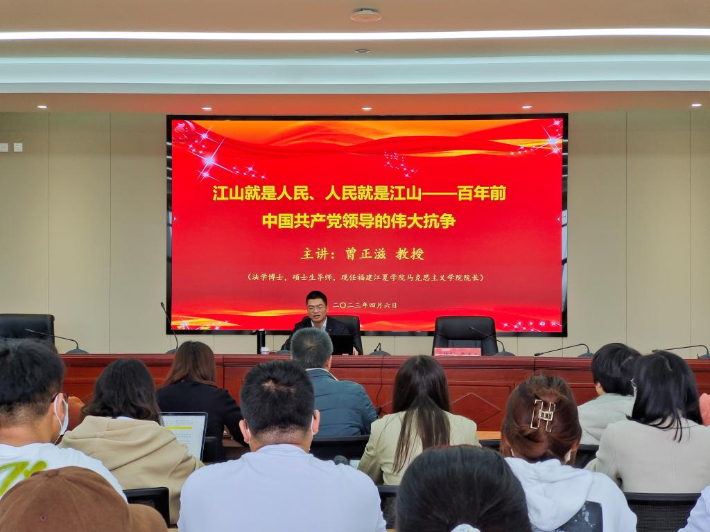 為幫助我校師生堅(jiān)持不懈用習(xí)近平新時(shí)代中國(guó)特色社會(huì)主義思想和黨的二十大精神凝心鑄魂,進(jìn)一步學(xué)習(xí)黨的百年奮斗重大成就和歷史經(jīng)驗(yàn),落實(shí)省委“深學(xué)爭(zhēng)優(yōu)、敢為爭(zhēng)先、實(shí)干爭(zhēng)效”行動(dòng)部署,2023年4月6日,我校邀請(qǐng)福建江夏學(xué)院馬克思主義學(xué)院院長(zhǎng)曾正滋教授在行政樓六樓會(huì)議室作題為《江山就是人民、人民就是江山——百年前中國(guó)共產(chǎn)黨領(lǐng)導(dǎo)的偉大抗?fàn)帯穼?zhuān)題講座。中層干部代表、思政課教師、“青馬工程”學(xué)員及習(xí)近平新時(shí)代中國(guó)特色社會(huì)主義思想讀書(shū)社學(xué)生參加講座,講座由馬克思主義學(xué)院院長(zhǎng)熊美蘭主持。