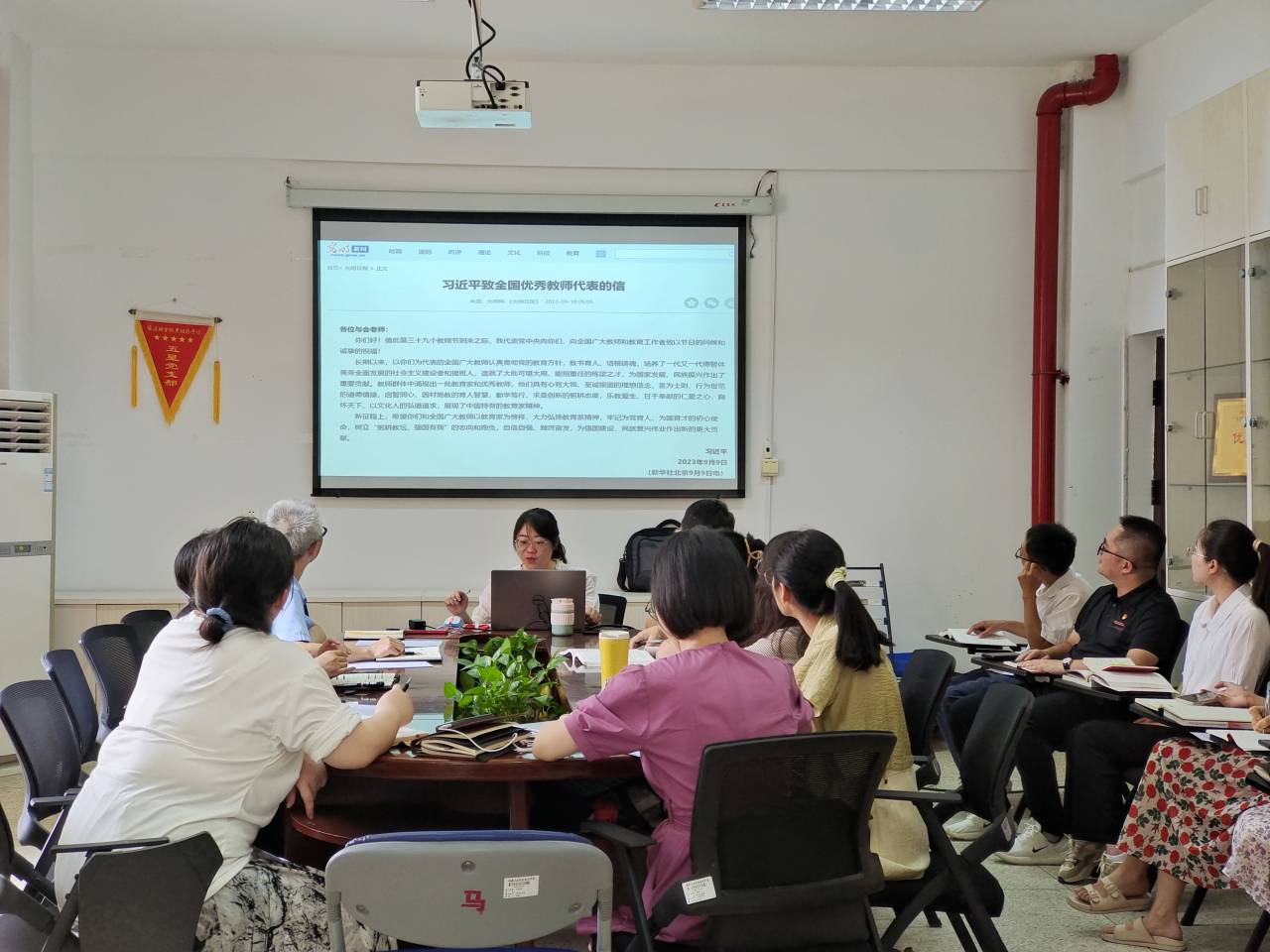 為深入學習習近平新時代中國特色社會主義思想,持續(xù)加強師德師風建設(shè),引導廣大教師堅定理想信念、陶冶道德情操、涵養(yǎng)扎實學識、勤修仁愛之心,直屬馬克思主義學院黨支部于9月14日在行政樓107開展“躬耕教耘 強國有我”主題黨日活動。