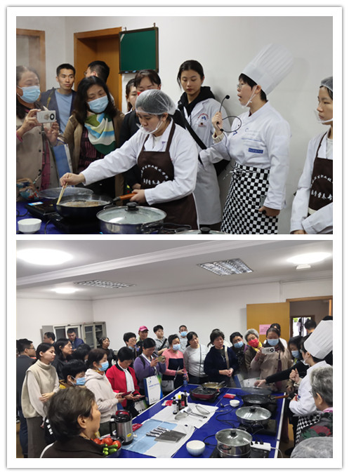 醫(yī)學(xué)營(yíng)養(yǎng)專業(yè)的黃麗娜老師帶領(lǐng)學(xué)生現(xiàn)場(chǎng)指導(dǎo)學(xué)員們完成一道操作簡(jiǎn)單且營(yíng)養(yǎng)價(jià)值豐富的膳食,并分享了老年人日常健康飲食的小竅門(mén),活動(dòng)現(xiàn)場(chǎng)氣氛活躍,互動(dòng)頻繁。