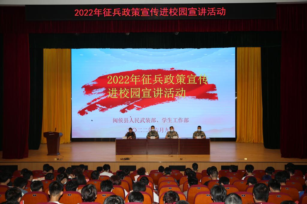 6月9日下午,我校聯(lián)合閩侯縣人民武裝部在學(xué)術(shù)報(bào)告廳舉辦“2022年征兵政策宣傳進(jìn)校園”活動(dòng)。閩侯縣人民武裝部、荊溪鎮(zhèn)人民武裝部及我校學(xué)生工作部征兵辦工作人員,各學(xué)院(系)2020級(jí)與2021級(jí)300多人參加宣講活動(dòng),活動(dòng)由學(xué)生工作部副部長(zhǎng)張麗萍主持。