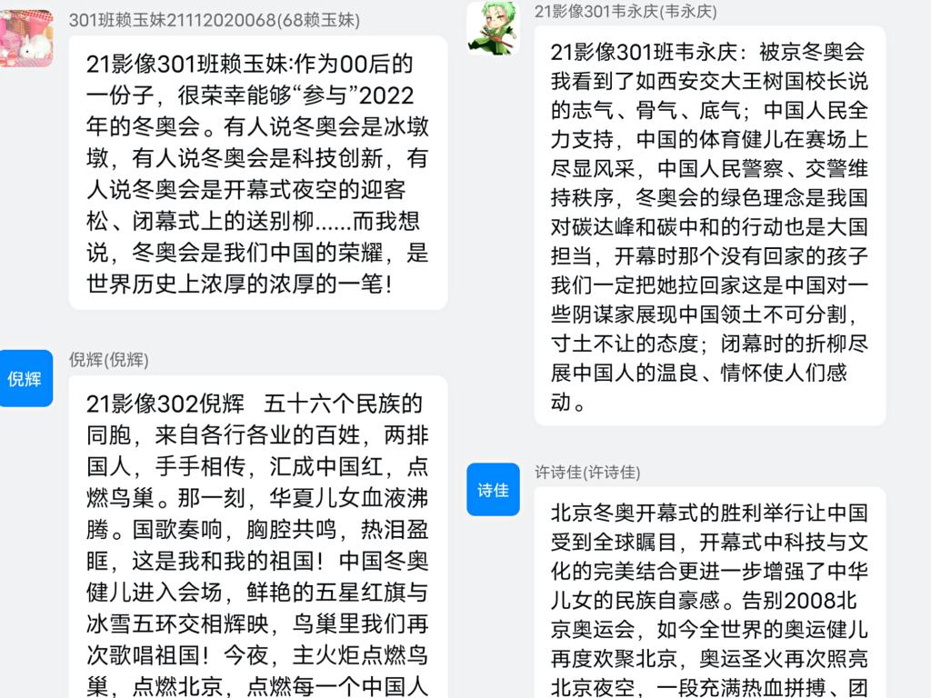 習(xí)近平新時(shí)代中國特色社會主義思想讀書社社長、21嬰托301班葉鎵萍感慨:冬奧會帶來的“C位”視角,讓中國青年擁有了“平視世界”的民族自信,深切感悟到“兩個變局”下的人生際遇與時(shí)代責(zé)任。中國青年要向奧運(yùn)健兒學(xué)習(xí),彰顯“勇于擔(dān)當(dāng)”色彩,將青春“小我”融入祖國“大我”;中國青年要向冬奧志愿者學(xué)習(xí),彰顯“艱苦奮斗”色彩,以永不懈怠的奮斗姿態(tài)投入攀高峰、立事業(yè)的實(shí)踐磨礪。