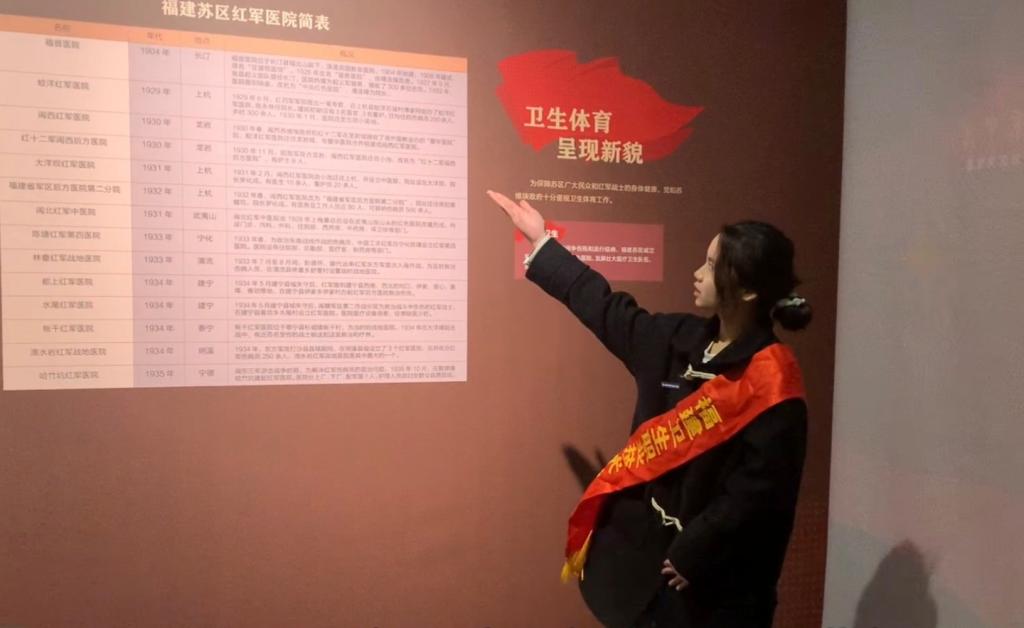 在福建省博物院,實踐隊隊員領會了閩文化的發(fā)展脈絡,感悟到歷史深處的文明之光。鐘雯菲、莊怡欣開展以“閩海雄風拓西洋”“閩臺血肉永相連”“福音醫(yī)院”為主題的志愿講解,帶領游客探尋福建如何劈波斬浪,成為人文蔚起的“海濱鄒魯”;感受閩臺一水,煙波相同,兩岸從石器時代至今始終存在無比深刻的聯系;了解中央蘇區(qū)紅色醫(yī)院——福音醫(yī)院,觸摸閩西光榮革命傳統(tǒng),傳承“紅醫(yī)精神”。