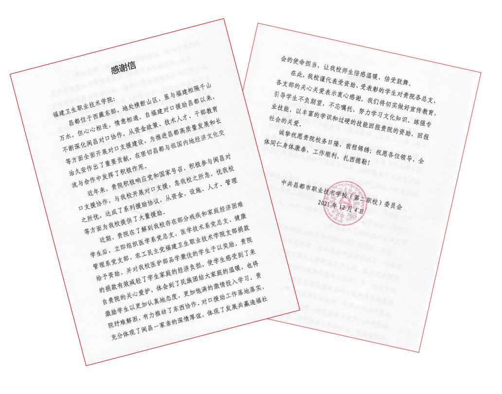 昌都市職業(yè)技術(shù)學(xué)校黨委委員、副校長(zhǎng)蔣昆對(duì)我校的愛(ài)心捐助表示衷心感謝,他指出,這份跨越千山萬(wàn)水的愛(ài)心不僅給困難家庭學(xué)生帶來(lái)一定的經(jīng)濟(jì)幫助,更使廣大學(xué)生感受到了來(lái)自福建衛(wèi)生職業(yè)技術(shù)學(xué)院的深切關(guān)心,讓全體師生倍感溫暖、倍受鼓舞,充分體現(xiàn)了閩昌一家親的深情厚誼和發(fā)展共贏造福社會(huì)的使命擔(dān)當(dāng),將激勵(lì)學(xué)生以更加認(rèn)真的態(tài)度、更加飽滿的激情投入文化知識(shí)學(xué)習(xí),練強(qiáng)專(zhuān)業(yè)技能,以豐富的學(xué)識(shí)和過(guò)硬的技能為祖國(guó)、為社會(huì)做出積極貢獻(xiàn)。同時(shí),中共昌都市職業(yè)技術(shù)學(xué)校(第二職校)委員會(huì)向我校發(fā)來(lái)一封感謝信。