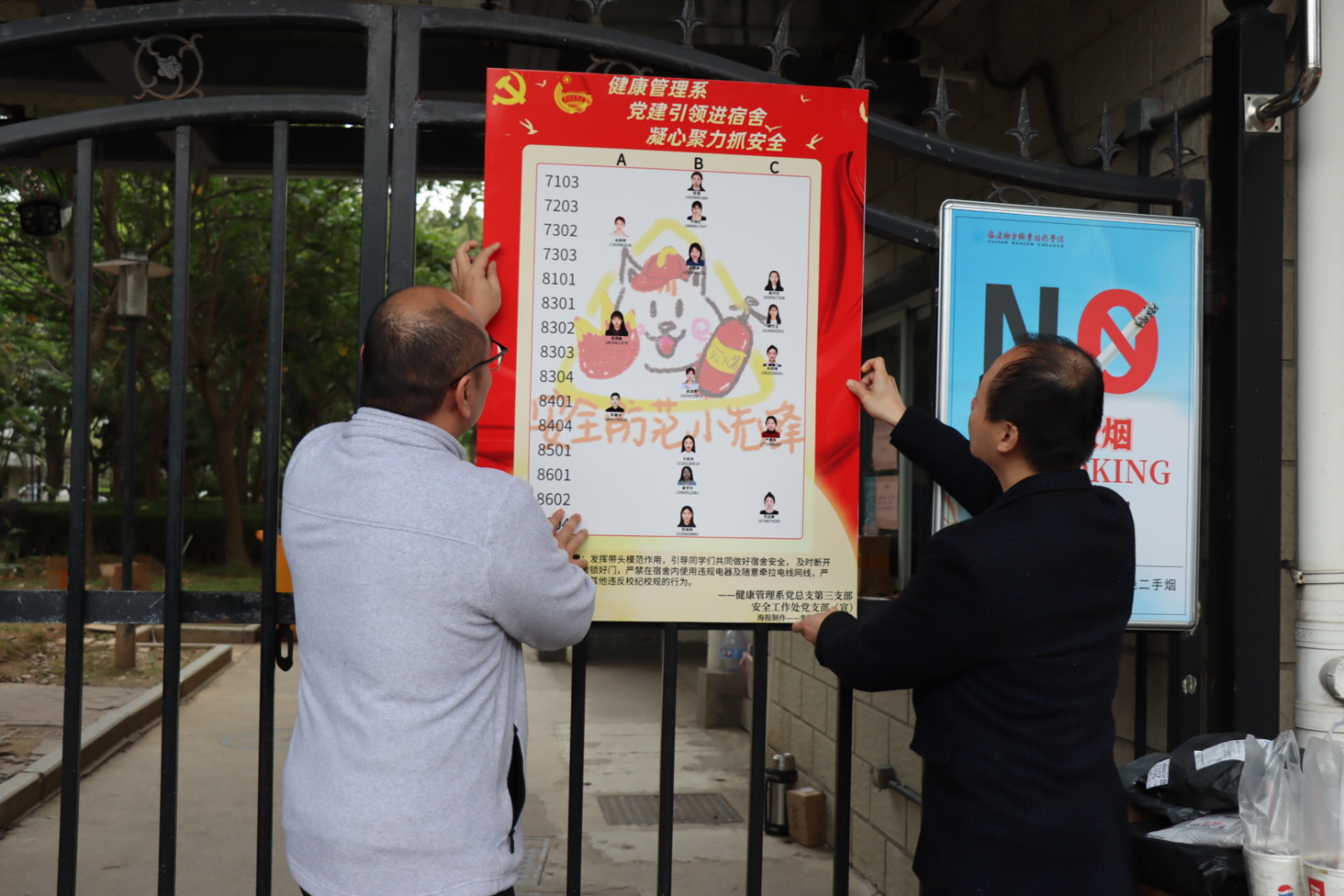 兩支部設(shè)立了由25個(gè)學(xué)生黨員和入黨積極分子任職的 “安全防范先鋒崗”,覆蓋健康管理系各年級(jí)宿舍,旨在通過(guò)安全小先鋒們的自我行為規(guī)范、定期安全主題宣傳、深入宿舍教育,引導(dǎo)其他同學(xué)以實(shí)際行動(dòng)打造安全、文明、衛(wèi)生的宿舍生活環(huán)境,樹立標(biāo)桿形象,以點(diǎn)帶面,以新?lián)?dāng)、新作為奮進(jìn)新時(shí)代。