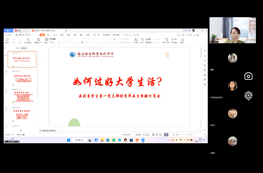 為幫助2022級學(xué)弟學(xué)妹緩解疫情期間上網(wǎng)課的迷茫和焦慮情緒,11月13日,醫(yī)學(xué)技術(shù)系學(xué)生第一黨支部組織畢業(yè)生黨員陸蘭梅、王露和溫?zé)槼删€上開展“如何過好大學(xué)生活”主題經(jīng)驗分享會。