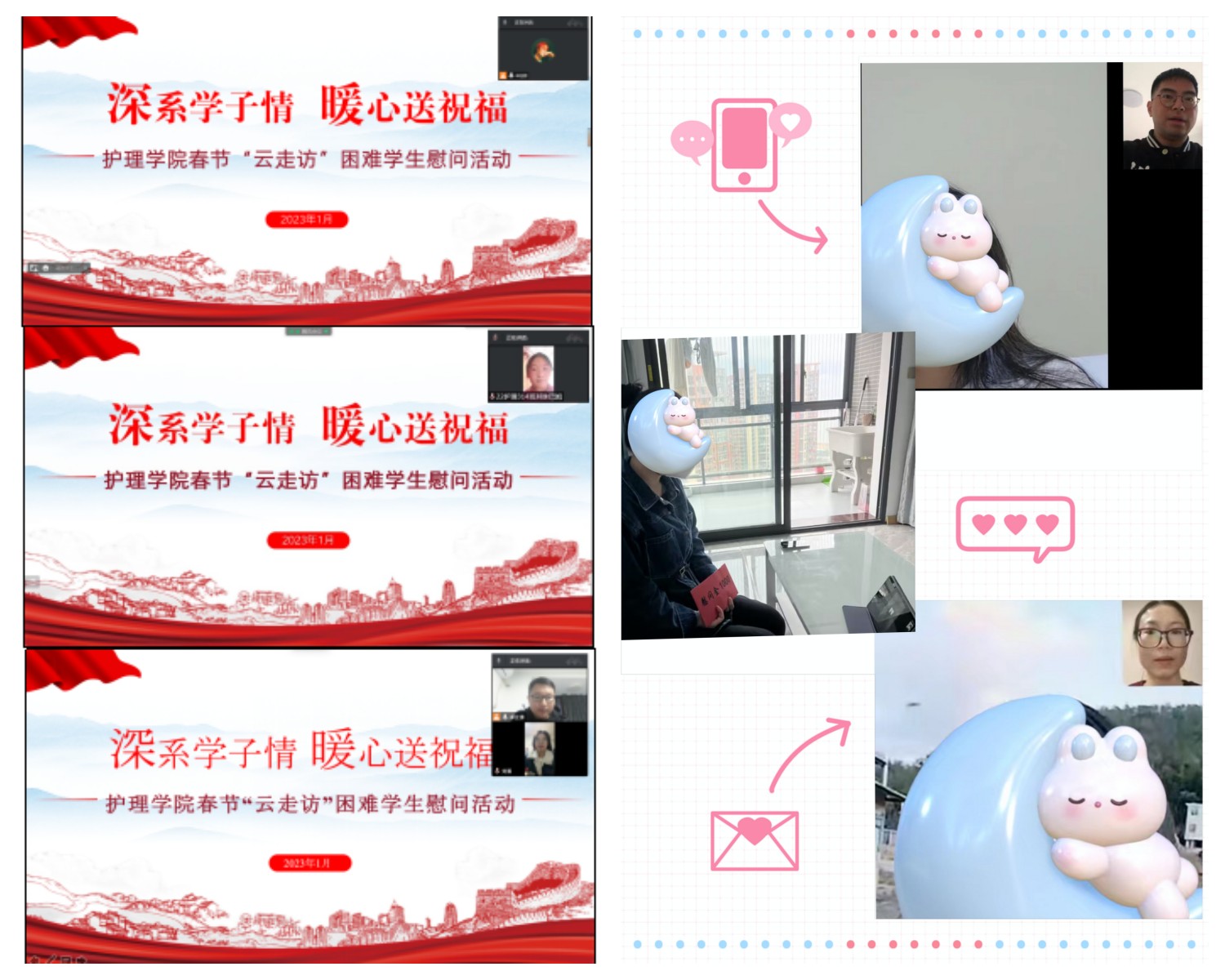 為進(jìn)一步扎實推進(jìn)高校資助育人工作,在疫情特殊時期切實關(guān)心關(guān)愛困難學(xué)生,我校以線上微信視頻、電話等方式開展了春節(jié)“云走訪”困難學(xué)生慰問活動,向她們送去學(xué)校的溫暖問候和春節(jié)祝福。