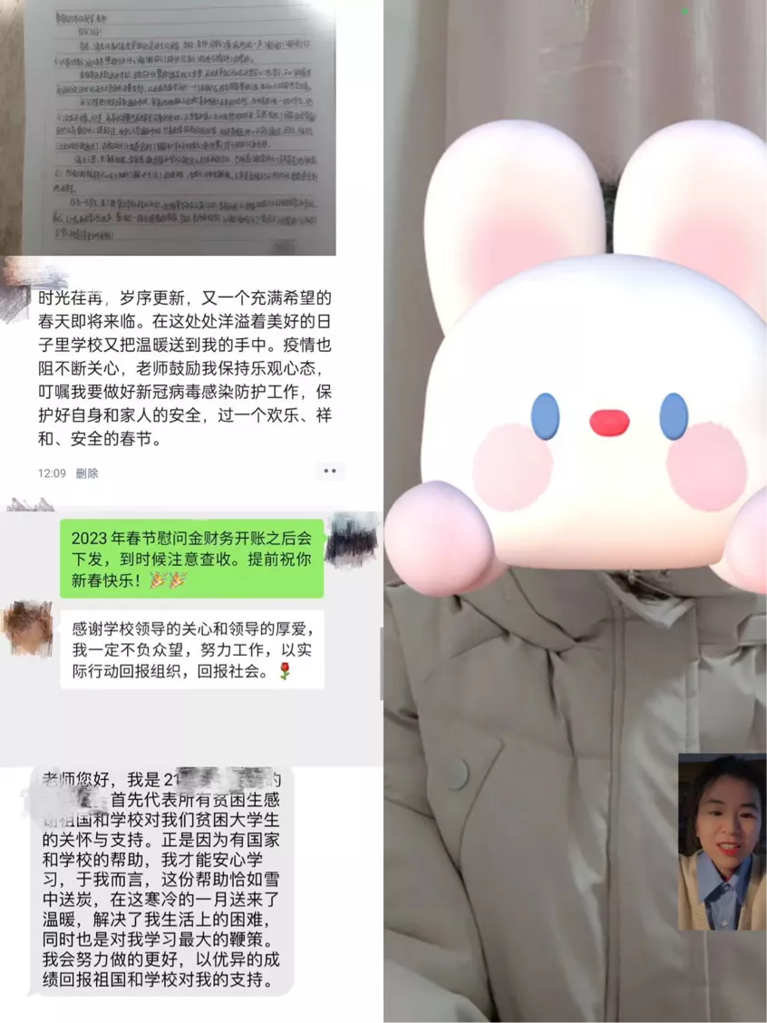 慰問結(jié)束后,同學(xué)們紛紛發(fā)來感謝短信,感激國家資助政策的支持,感謝學(xué)校和老師的溫暖關(guān)懷,表示未來將再接再厲、踔厲奮發(fā)、學(xué)有所成,報答學(xué)校和老師的殷切栽培,并向老師們送上了新春祝福。