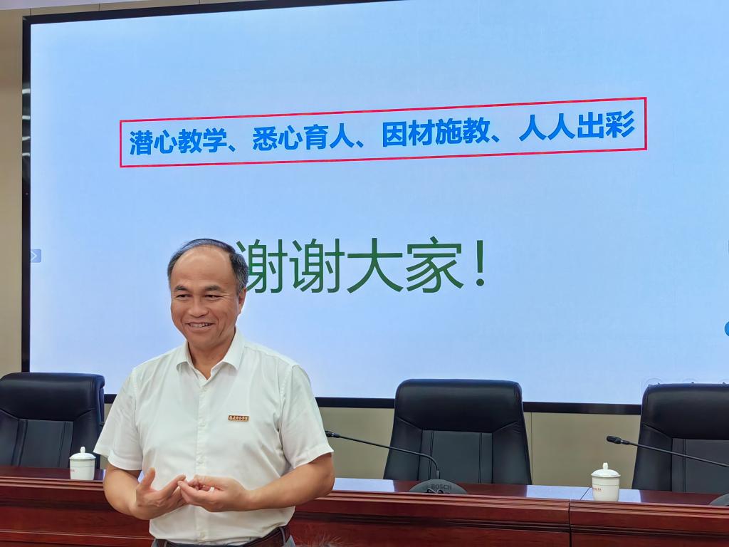 他用生動的事例和自身教學(xué)工作經(jīng)歷,勉勵新教師要成為新時代的“教育家”,要擁有大胸懷、大境界、大格局的“道術(shù)”,要有學(xué)科深厚、專業(yè)精湛的“學(xué)術(shù)”,要有育人水平高超,方法技術(shù)嫻熟的“技術(shù)”,要有有滋有味,有情有義的“藝術(shù)”,要有有溫度的愛,有穿透力的愛的“仁術(shù)”,并寄予新教師潛心教學(xué)、悉心育人、因材施教、人人出彩的殷切希望。