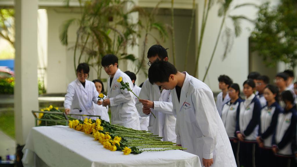 4月3日,醫(yī)學(xué)院舉辦“緬懷無(wú)言良師,追思醫(yī)學(xué)大愛(ài)”清明主題紀(jì)念活動(dòng)。醫(yī)學(xué)院教師第二黨支部黨員、解剖學(xué)教研室教師、校健康科普青年講團(tuán)成員、2024級(jí)臨床醫(yī)學(xué)(高本貫通)專(zhuān)業(yè)學(xué)生代表參加此次活動(dòng),閩侯縣職業(yè)中專(zhuān)學(xué)校師生代表受邀出席活動(dòng)。