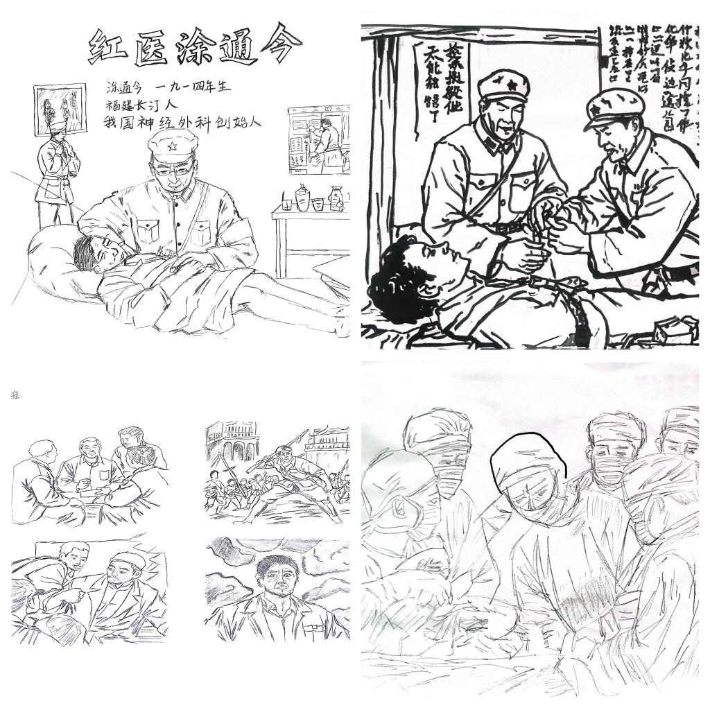 《長(zhǎng)征走出的醫(yī)學(xué)博士——涂通今》通過(guò)繪畫(huà)形式,追憶了紅軍軍醫(yī)涂通今歷經(jīng)長(zhǎng)征淬煉,成長(zhǎng)為我國(guó)神經(jīng)外科奠基人,以戰(zhàn)火中錘煉的醫(yī)術(shù)開(kāi)創(chuàng)醫(yī)學(xué)新領(lǐng)域,畢生奉獻(xiàn)于戰(zhàn)傷救治與醫(yī)學(xué)教育傳承的生動(dòng)事跡?!都t色華佗——傅連暲》《肝膽春秋——吳孟超》《最美逆行者》等一幅幅畫(huà)作,以筆墨定格不同歷史時(shí)期的紅醫(yī)群體,銘刻著一代代紅醫(yī)為中國(guó)醫(yī)療衛(wèi)生事業(yè)立下的不朽功勛,再現(xiàn)了紅色閩醫(yī)從革命烽火到建設(shè)浪潮中始終堅(jiān)守醫(yī)者仁心、迎難而上的精神圖譜。
