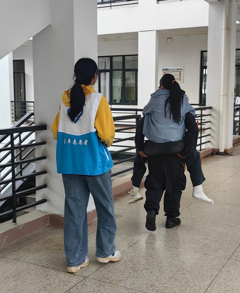 該考生因傷坐輪椅入校,看著在崇教樓四樓的考室心里犯了難。保安崔心銜和徐建林見狀,主動上前伸出援手,在征得同意后,背起考生上了樓,又在考試結(jié)束后將其背下樓。這一舉動不僅體現(xiàn)了學(xué)校對考生的關(guān)心和支持,更展示了學(xué)校始終貫徹服務(wù)育人理念,堅(jiān)持德育工作走深走實(shí)。