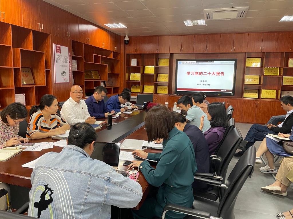 醫(yī)學(xué)院黨總支通過(guò)全院教職工大會(huì)、黨總支理論學(xué)習(xí)中心組(擴(kuò)大)會(huì)議、主題黨日、主題班會(huì)、團(tuán)日活動(dòng)等形式,全面系統(tǒng)地將黨的二十大報(bào)告的思想精髓及核心要義,傳達(dá)到每一位師生員工。同時(shí),還圍繞學(xué)習(xí)貫徹黨的二十大精神,展開(kāi)主題研討和心得交流活動(dòng),以思想碰撞夯實(shí)理想信念之基,推進(jìn)學(xué)習(xí)走心、走實(shí)、走深。