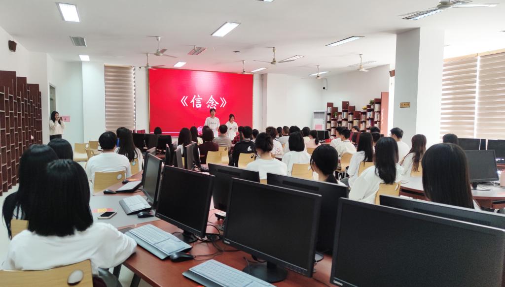 “這是一聲砸向舊世界的錘頭撞擊,合著十月革命驚天霹靂!”圖書館二樓電子閱覽室里傳出了慷慨激昂的青春呼聲,學(xué)生朗誦《信念》,拉開了主題黨日活動(dòng)的序幕。同學(xué)們聲情并茂的演繹,向師生黨員們講述著中國共產(chǎn)黨人征途漫漫的信仰之旅,將不同時(shí)期的中國故事通過朗誦傳遞給每位師生黨員,激發(fā)師生黨員們的民族自豪感和自信心。