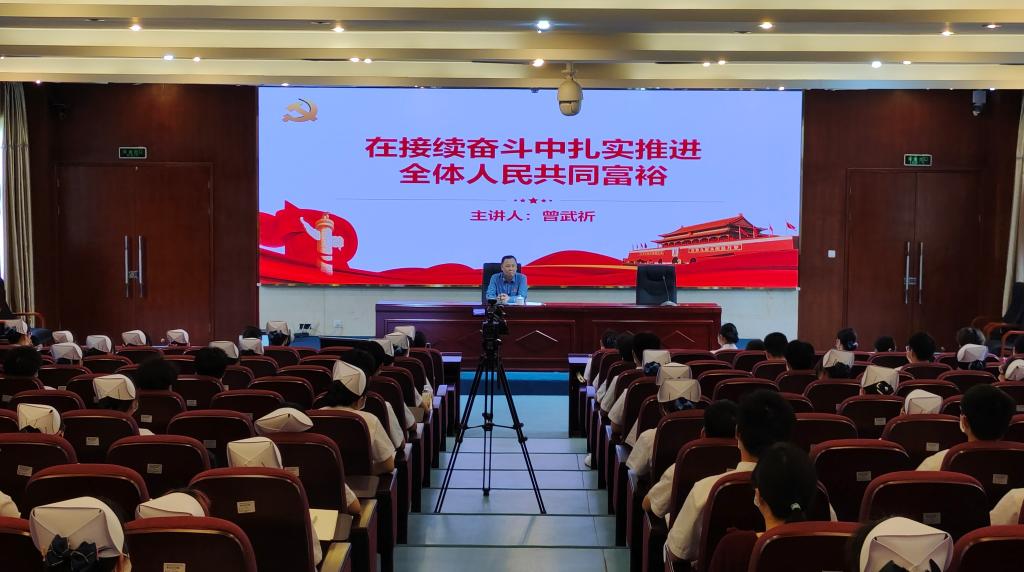 曾武祈以“在接續(xù)奮斗中扎實推進共同富?!睘轭},講述“時代三大件”“閩寧山海情”“三進下黨鄉(xiāng)”等一個個難忘的脫貧故事,詳細(xì)介紹習(xí)近平總書記在福建任職期間,推動對口幫扶、促進共同富裕重大工程及相關(guān)論述,透徹分析了共同富裕的科學(xué)內(nèi)涵、實踐途徑及未來征程。談到我校中職護理專業(yè)精準(zhǔn)技術(shù)扶貧委培班時,曾武祈向在場同學(xué)贈送由他主編的《教育點燃希望》書籍。他指出,我校始終與黨和國家同頻共振,堅定不移地在共同富裕背景下推動學(xué)校的高質(zhì)量發(fā)展,將凝聚青年力量作為立德樹人工作的重中之重。他號召閩衛(wèi)學(xué)子們潛精研思,做共同富裕思想的堅定學(xué)習(xí)者;矢志奮斗,做共同富裕的忠實踐行者。