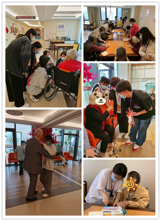 結(jié)束交流后,同學(xué)們?cè)谔┛抵夜ぷ魅藛T的帶領(lǐng)下,分組進(jìn)入園區(qū)的護(hù)理公寓,在園區(qū)護(hù)理師團(tuán)隊(duì)老師的指導(dǎo)下,一同參與到在園區(qū)生活的長(zhǎng)者們的文體活動(dòng)中,與長(zhǎng)者們一起完成一個(gè)小游戲、一幅畫、一首舞曲,并送上對(duì)長(zhǎng)者們的祝福。