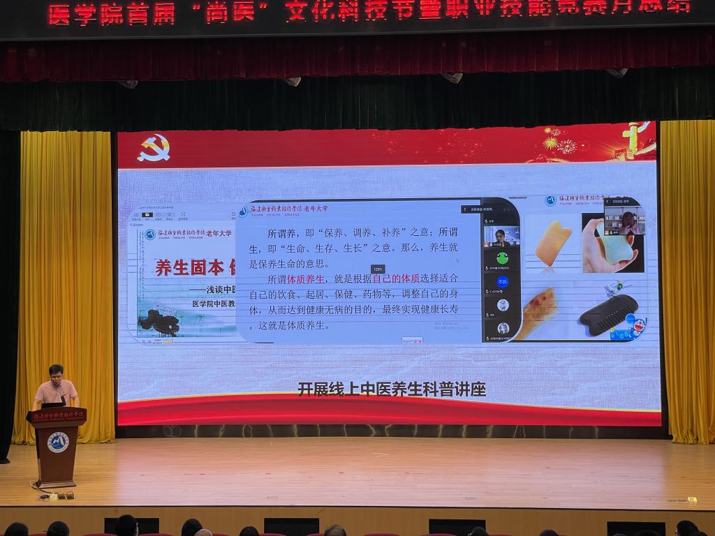 醫(yī)學(xué)院副院長(zhǎng)鄧元榮作活動(dòng)總結(jié)。他表示,本次文化科技節(jié)暨職業(yè)技能競(jìng)賽月活動(dòng)成效顯著,一是思想引領(lǐng),融入思政,構(gòu)建“三全育人”新模式;二是賽教結(jié)合,科教融匯,篩選一批競(jìng)賽選手;三是產(chǎn)教融合,校企合作,形成協(xié)同育人案例;四是對(duì)接臨床,實(shí)踐改革,提高專業(yè)建設(shè)水平。他希望同學(xué)們用青春踐行黨的二十大精神,揚(yáng)帆啟航,劈波斬浪,鑄造屬于我們這一代人的新功績(jī)。
