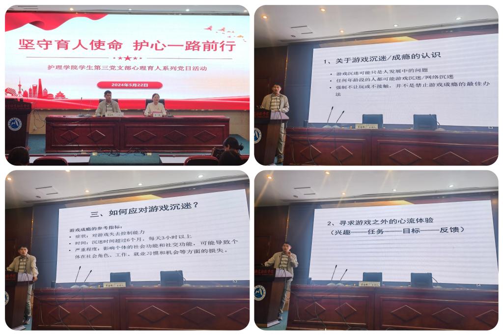 五月,是青春的季節(jié),也是成長(zhǎng)的季節(jié)。在這個(gè)充滿活力與希望的月份里,護(hù)理學(xué)院學(xué)生第三黨支部聯(lián)合護(hù)理學(xué)院護(hù)心苑精心策劃并舉辦了心理育人系列黨日活動(dòng),旨在通過(guò)專家講座和多彩活動(dòng),為學(xué)生提供心理支持和幫助,引導(dǎo)他們健康成長(zhǎng)。本次系列活動(dòng)不僅邀請(qǐng)了三位心理學(xué)領(lǐng)域?qū)<?,還精心策劃了多項(xiàng)富有創(chuàng)意的實(shí)踐活動(dòng),旨在通過(guò)理論與實(shí)踐相結(jié)合的方式,為學(xué)生們提供全面而深入的心理健康教育。
