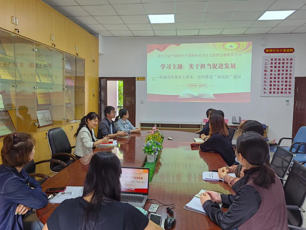 為推動學(xué)習(xí)貫徹習(xí)近平新時代中國特色社會主義思想主題教育走深走實,5月11日,藥學(xué)院第一黨支部開展“實干擔(dān)當(dāng)促進發(fā)展”專題學(xué)習(xí),支部書記羅蘭主持。