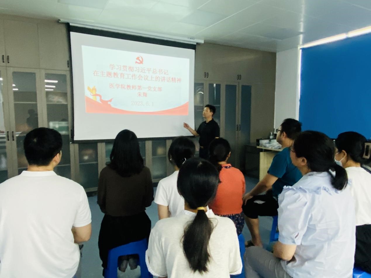 連日來,醫(yī)學院教師第一黨支部開展學習貫徹習近平新時代中國特色社會主義思想主題教育,通過原原本本學、全面系統(tǒng)學、聯(lián)系實際學等多種形式,掀起了教師學習貫徹主題教育精神的熱潮。為進一步鞏固主題教育學習成果,6月12日,支部書記朱翔給支部全體黨員上了一堂意義深刻的專題黨課。