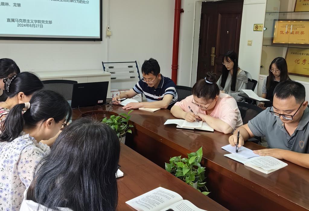 生活紀(jì)律是黨員在日常生活和社會(huì)交往中應(yīng)當(dāng)遵守的行為規(guī)則,其本質(zhì)要求是踐行社會(huì)主義核心價(jià)值觀,明大德、守公德、嚴(yán)私德。2024年6月27日,馬克思主義學(xué)院黨總支黨紀(jì)學(xué)習(xí)教育讀書班在厚德樓107會(huì)議室圍繞《中國(guó)共產(chǎn)黨紀(jì)律處分條例》開展第七次集體學(xué)習(xí)活動(dòng)。