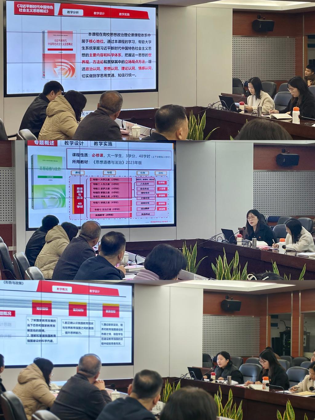 校領(lǐng)導(dǎo)分別對三門課程的集備展示進行了精準(zhǔn)點評,高度評價集體備課成果成效,并針對教學(xué)內(nèi)容的準(zhǔn)度、深度及課程邏輯的嚴(yán)密性提出建設(shè)性意見。校長許能鋒表示,要始終以學(xué)生發(fā)展需要為中心,區(qū)分教學(xué)目標(biāo)與學(xué)習(xí)目標(biāo),強化課程內(nèi)容的針對性與吸引力;要聚焦內(nèi)在發(fā)展需求,將黨的最新理論成果和時事熱點融入教學(xué),使學(xué)生能夠?qū)W以致用,真正將理論知識轉(zhuǎn)化為實踐動力;要深化對教育強國的理解與認識,凝練學(xué)校發(fā)展成果,以校本化案例強化學(xué)生認知。校黨委書記曾武祈聚焦思政課建設(shè),提出明確要求和殷切期望。一是總結(jié)提升規(guī)范化,要制定標(biāo)準(zhǔn)化集體備課流程,加強集體備課成果的總結(jié)提煉,確保備課過程規(guī)范有序。二是常備多磨高質(zhì)量,要建立常態(tài)化集體備課機制,加強教學(xué)資源的共建共享,深入交流教學(xué)理念、教學(xué)方法和教學(xué)策略,共同解決教學(xué)難點問題。三是求新求進求共情,要關(guān)注學(xué)生的學(xué)習(xí)需求和學(xué)習(xí)體驗,將社會熱點融入課程建設(shè),大膽嘗試新的教學(xué)理念、教學(xué)方法和教學(xué)手段,不斷提升課堂教學(xué)效果。四是點面兼顧節(jié)奏穩(wěn),要突出重點,統(tǒng)籌兼顧,循序漸進地引導(dǎo)學(xué)生實現(xiàn)課程目標(biāo),從掌握課程精髓到領(lǐng)悟其中蘊含的世界觀、方法論。
