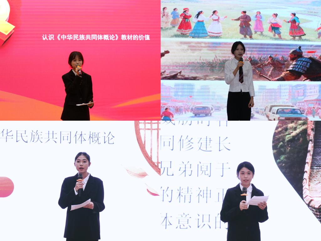 比賽現(xiàn)場,15名選手依托《中華民族共同體概論》教材,結(jié)合自身的學(xué)習(xí)、生活實踐,從不同維度深刻闡釋了對中華民族共同體意識的深刻認(rèn)知。他們或以激昂澎湃之態(tài),縱論各民族在歷史長河中披荊斬棘、攜手共進(jìn)的壯闊征程,從“昭君出塞”的民族和親佳話,到“土爾扈特萬里東歸”的愛國壯舉,再到抗日戰(zhàn)爭時期各族兒女同仇敵愾、共御外侮的英勇事跡,生動展現(xiàn)中華民族強(qiáng)大的凝聚力和向心力;或以溫情細(xì)膩之筆,講述身邊平凡而感人的民族團(tuán)結(jié)故事,社區(qū)里各族居民互幫互助的溫馨場景、校園中不同民族同學(xué)攜手共進(jìn)的青春身影,傳遞出民族團(tuán)結(jié)一家親的深厚情誼,充分彰顯新時代青年勇?lián)姑?、矢志報國的堅定決心,引發(fā)了在場師生的深刻共鳴。