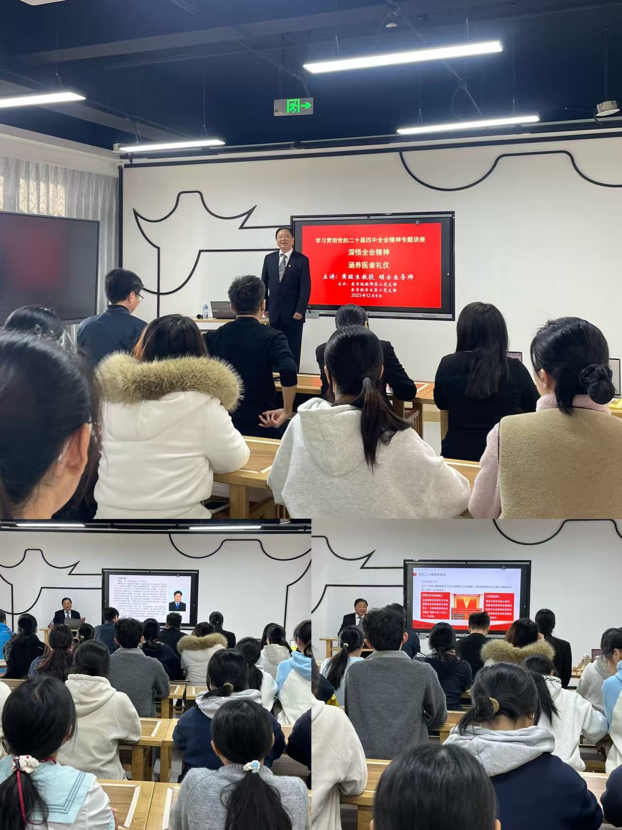 講座緊扣黨的二十屆四中全會精神,從把握“兩個大局”、引領(lǐng)黨員師生擔(dān)當(dāng)使命、提升醫(yī)者禮儀素養(yǎng)、促進(jìn)黨建與業(yè)務(wù)深度融合等方面進(jìn)行了系統(tǒng)解讀。黃旺生強調(diào),黨員教師要在政治引領(lǐng)、專業(yè)發(fā)展、師德師風(fēng)上走在前,主動把黨的二十屆四中全會精神融入課程思政和教育教學(xué)實踐中;要以良好醫(yī)者禮儀服務(wù)患者、塑造職業(yè)形象、構(gòu)建和諧醫(yī)患關(guān)系;要把黨建工作貫穿教學(xué)科研與人才培養(yǎng)全過程,通過制度建設(shè)與治理效能提升推動醫(yī)藥高職教育高質(zhì)量發(fā)展。