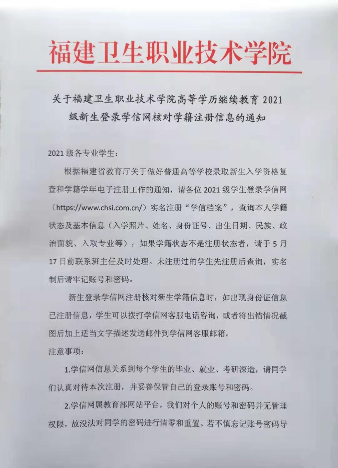 關于福建衛(wèi)生職業(yè)技術學院高等學歷繼續(xù)教育2021級新生登錄學信網(wǎng)核對學籍注冊信息的通知